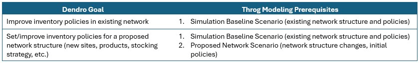 Throg scenario results serve as one piece of input for a Dendro run. Identification of the appropriate Throg scenario to apply Dendro to depends on the goal of the Dendro study. The network structure under which the modeler is seeking to optimize inventory policies must be represented in a Throg scenario.