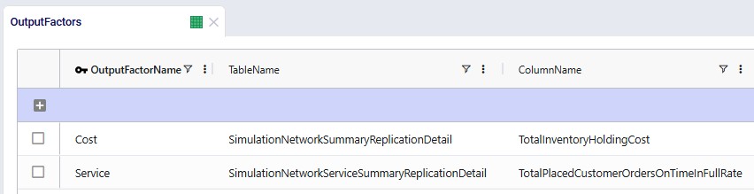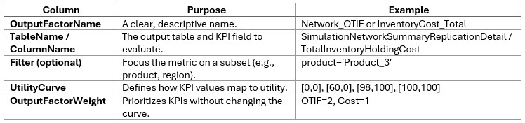 Once Dendro knows what it can vary, it needs to know how to judge success. The Output Factors input table defines the KPIs Dendro will use to evaluate each scenario and how they are scored.