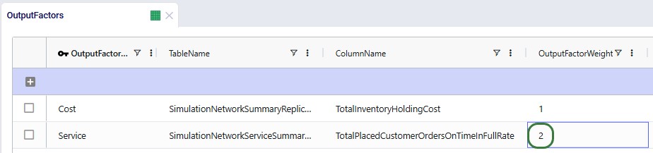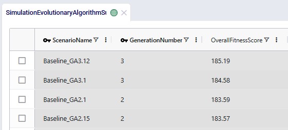 Each scenario has an overall fitness score, calculated as the weighted sum of its output factor utility values. A higher score means the scenario performed well according to the priorities you set (e.g., balancing low cost with high service).