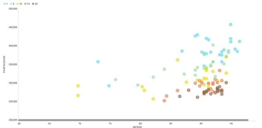 Use Case: Adjust inventory policy parameters (e.g., reorder point, reorder quantity, policy type) to find configurations that deliver the best cost-service trade-offs.