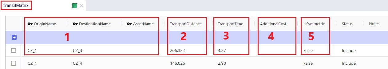In the Transit Matrix table, the transport distance and time for any source-destination-asset combination that could be considered as a segment of a route by Hopper can be specified. Note that the UOM fields in this table are omitted in following screenshot: