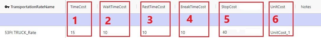 Scrolling further right in the Transportation Rates table we see the remaining cost fields: