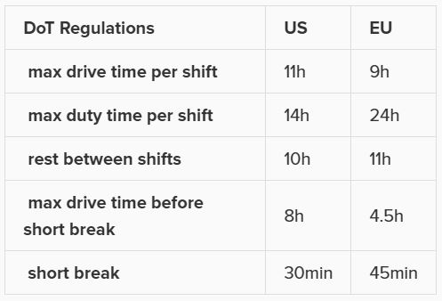 As a reference, these are the department of transportation driver regulations in the US and the EU. They have been somewhat simplified from these sources: US DoT Regulations and EU DoT Regulations:
