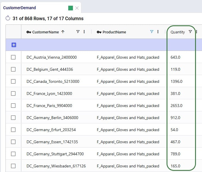 After clicking the Run SQL button, we can have a look in the Customer Demand input table, where we find the expected 200 records (50 customers which each have demand for 4 products) and eyeballing the values in the Quantity field we see the numbers are as expected between 10 and 1000: