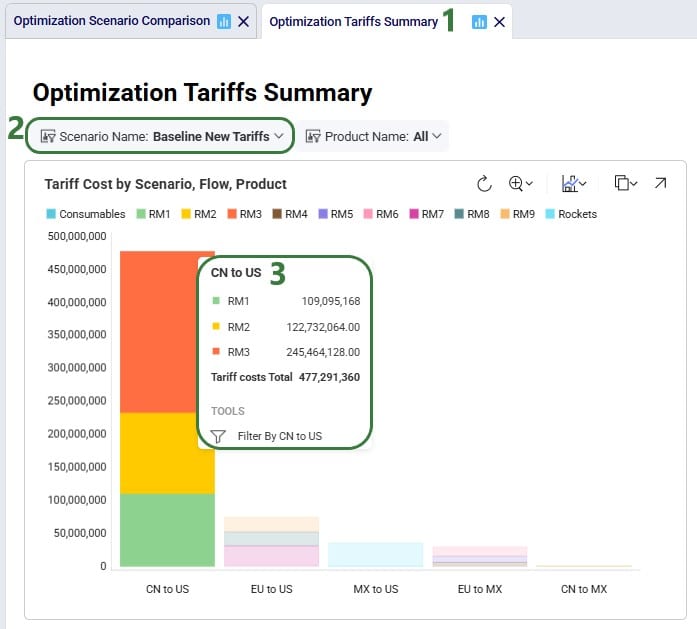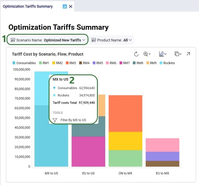 To compare the Tariffs by path origin – path destination and product, a new “Optimization Tariffs Summary” dashboard was created. We will look at the Baseline New Tariffs scenario first, and the Optimized New Tariffs scenario next: