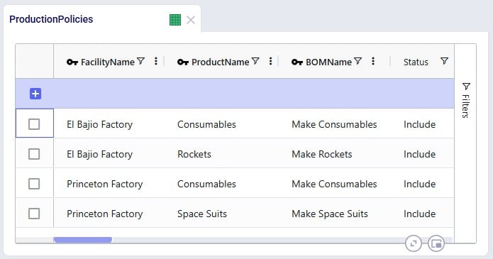 Looking at the Production Policies input table, we see that both the US and Mexico factory can produce Consumables, but Rockets are only manufactured in Mexico and Space Suits only in the US: