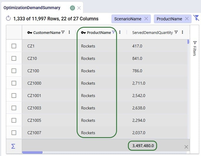 Next, we will take a closer look at some more detailed outputs. Starting with how much demand there is in the model for Rockets and Consumables, the 2 finished goods the Mexican factory in El Bajio can manufacture. The next screenshot shows the Optimization Demand Summary network optimization output table, filtered for Rockets and with a summation aggregation applied to it to show the total demand for Rockets at the bottom of the grid:
