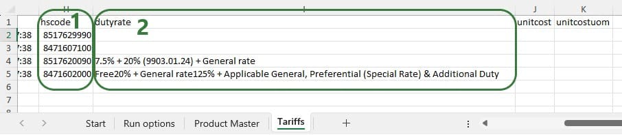 After also running the HS Code Classification and the Duty Rate Lookup workflows (bullets 6 and 7 in the list further above), we see that these fields are now also populated on the Tariffs worksheet: