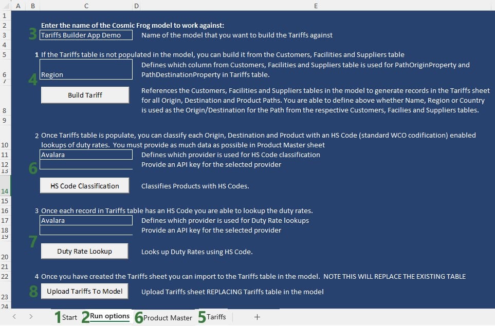 The 3 utilities covered in the previous section to generate and populate the Tariffs input table are also made available in the Cosmic Frog for Excel Tariffs Builder App, which we will cover in this section. Users can download this application and related files from the Resource Library.