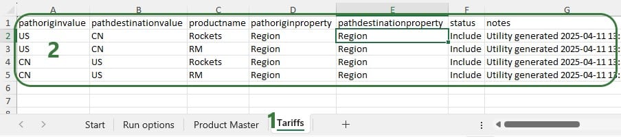 Note that columns B-F contain information of products that do not match the product name in Cosmic Frog as this is just an example to show how the utility works.