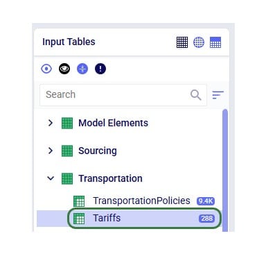 To enter tariffs and take them into account in a network optimization (Neo) run, users need to populate the new Tariffs input table: