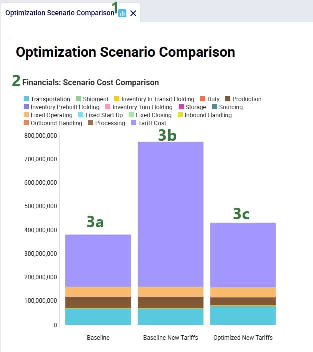 The Financials stacked bar chart in the standard Optimization Scenario Comparison dashboard in the Analytics module of Cosmic Frog can be used to compare all costs for all 3 scenarios in 1 graph: