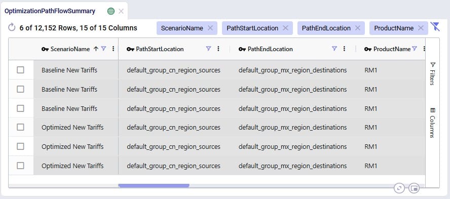 For the 2 scenarios that use the new tariffs, records are filtered out for raw material RM1 where the Path Start Location represents the CN region and the Path End Location represents the MX region. These Path Start and End Locations are automatically generated based on the Path Origin Property and Value and Destination Property and Value set in the Tariffs input table. Scrolling right for these 6 records: