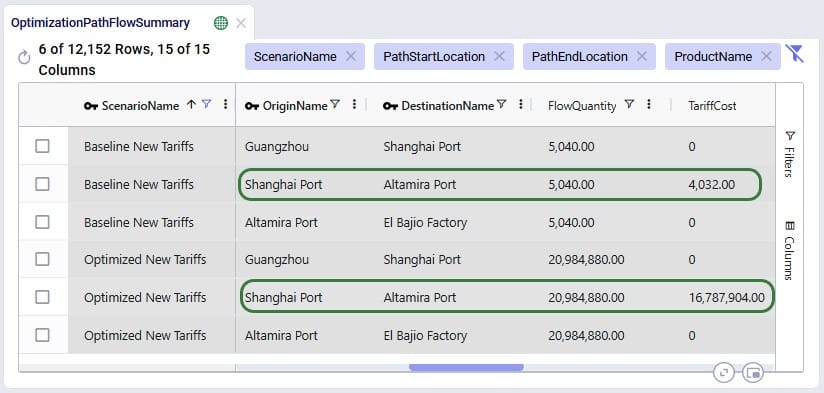 Since the production of Consumables requires raw materials RM1, RM2, and RM3, we expect to see the above production quantities for Consumables to be reflected in the amount of these raw materials that was moved from the suppliers in China to the US vs to Mexico. We can see this in the Optimization Flow Summary network optimization output table, which is filtered for the 2 scenarios with new tariffs, Port to Port lanes, and these 3 raw materials: