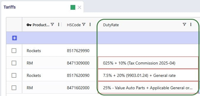 The raw output from the API is placed in the Duty Rate field and user needs to update this so that the field contains just a number representing the total duty rate. For the second record (US region to China region for product RM), the total duty rate is 35% (25% + 10%), and user needs to enter 35 in this field. For the third record (China region to US region for product Rockets), the duty rate is 27.5% (7.5% + 20%), and user needs to enter 27.5 in this field. For the fourth record (China region to US region for product RM), the total duty rate is 25%, and user needs to enter 25 in this field.
