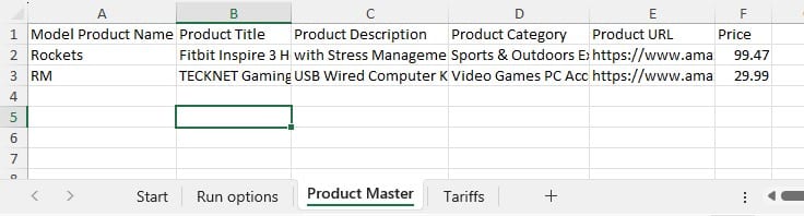 The next screenshot shows the Product Master worksheet which contains the product information to be used by the HS Code Classification workflow, it needs to be in this format and users should enter as much product information in here as possible: