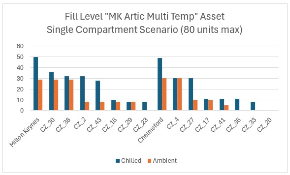 Both scenarios have other single-compartment assets available. In each scenario, the MK Artic Multi Temp asset is used for one route. The charts below show how much of each product is on board at each stop along that route (stops are ordered by route sequence on the x-axis; the asset is loaded at Milton Keynes and Chelmsford depots and delivers to the CZ locations).