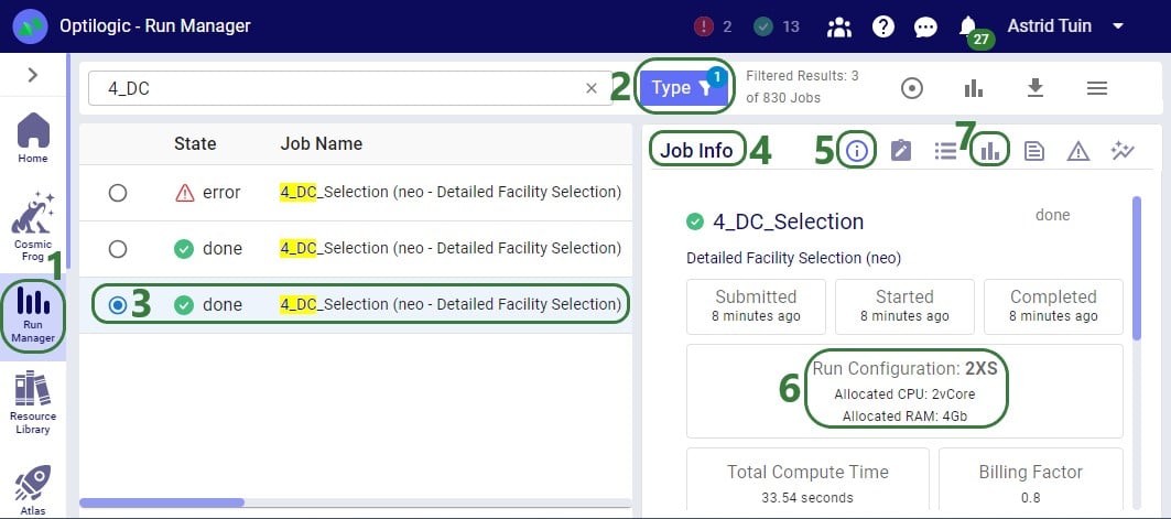 After running a scenario with the initially selected resource size, users can evaluate if it is the best resource size to use or if a smaller or larger one is more appropriate. The Run Manager application on Optilogic’s platform can be used to assess resource size: