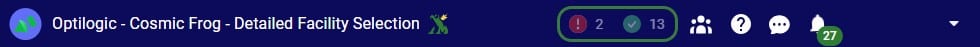 In the status bar at the top of Cosmic Frog, user can see that there were 2 error jobs and 13 done jobs within the last 24 hours.