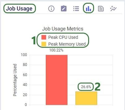 Using this knowledge that the RAM required at peak usage is just over 1 Gb, we can conclude that going down to resource size 3XS, which has 2Gb of RAM available should still work OK for this scenario. The expectation is that going further down to 4XS, which has 1Gb of RAM available, will not work as the scenario will likely run out of memory. We can test this with 2 additional runs. These are the Job Usage Metrics after running with resource size 3XS: