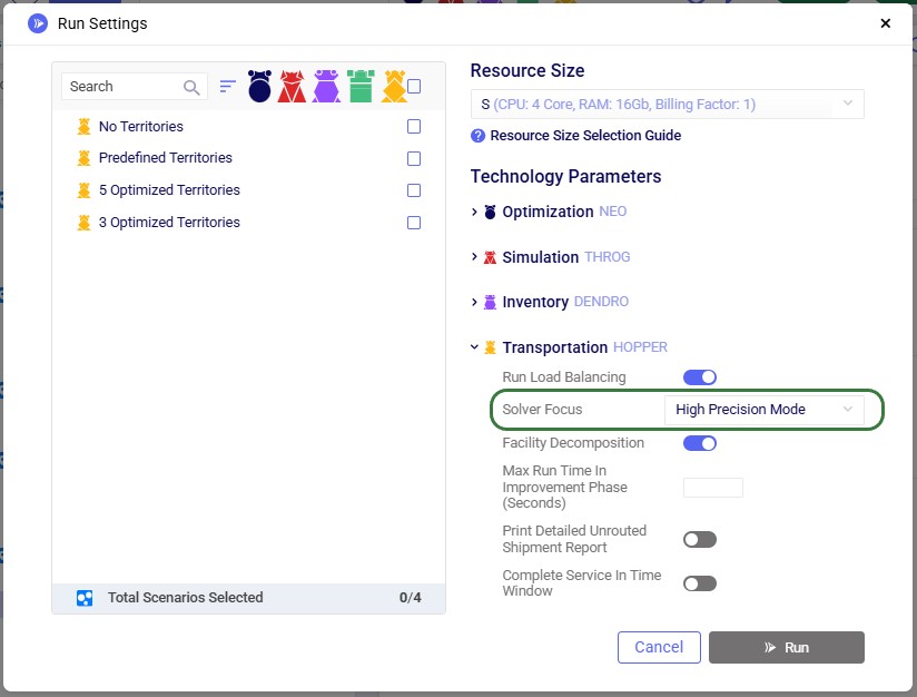 The genetic algorithm is available in Hopper's High Precision solver mode and powers all Hopper optimizations, not just territory planning. To turn on high precision mode, expand the Transportation (Hopper) section on the Run Settings modal which comes up after clicking on the green Run button at the right top in Cosmic Frog. Then select "High Precision mode" from the Solver Focus drop-down list: