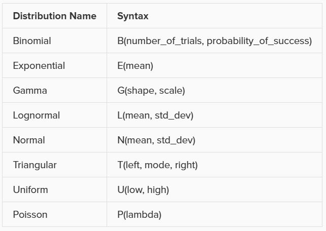 Several input columns used by Throg (Simulation) will accept distributions as inputs. The following distributions, along with their syntax, are currently supported by Throg: