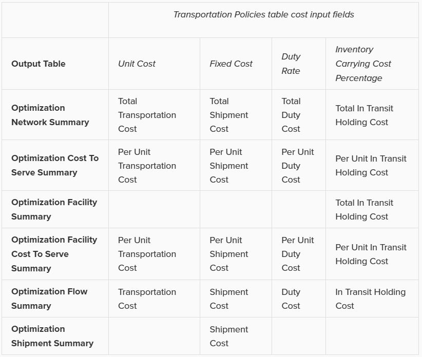 The following table gives an overview of how the inputs into the 4 cost fields on the Transportation Policies table translate to outputs in multiple optimization output tables. The table contains the field names in the output tables and shows from which input field they result.