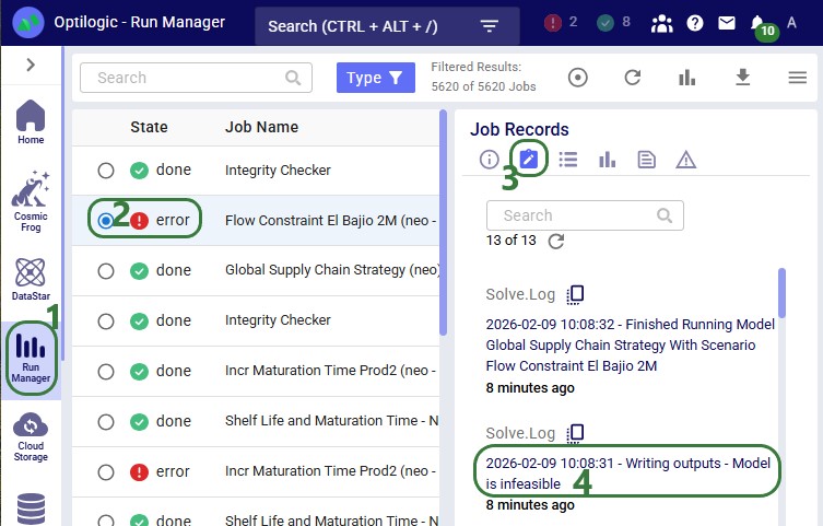 In the Run Manager application, also on the Optilogic Platform, users can select the scenario run, which will have Status = Error, and look at the run's logs on the right-hand side: