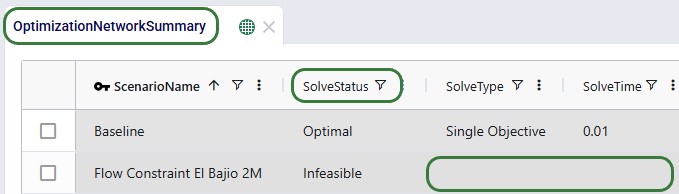 If a Neo (network optimization) scenario run is infeasible, a user can tell from within Cosmic Frog and also by looking at the run's logs in the Run Manager application. Within Cosmic Frog, the Optimization Network Summary output table will show Solve Status = Infeasible and many other output columns, such as Solve Type and Solve Time, will be blank: