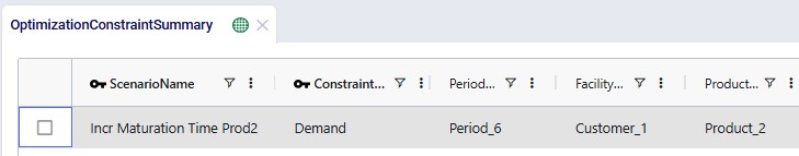 Here the constraint that cannot be fulfilled is the demand for 1,000 units of Product_2 in Period_6. The output in the Constraint Summary output table is telling us that a way to make this feasible is to change the demand quantity to be 0. We will need to investigate the model inputs further to understand why this is. On further inspection, the infeasibility cause is found to be that the maturation time of Product_2 is set to 50 days. This is longer than the model horizon of 42 days (6 weekly periods). So, if no or not enough initial inventory is present in the model, Product_ 2 cannot be made and mature in time to fulfill demand in Period_ 6.