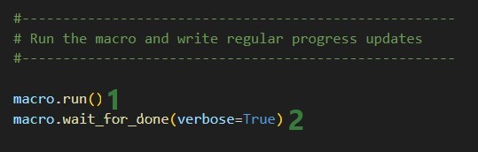 In this documentation we will cover how to use the library through multiple examples. At the end, we will step through an end-to-end script that creates a new project, adds a macro to the project, and creates multiple tasks that are added to the macro. The script then runs the macro while giving regular updates on its progress.