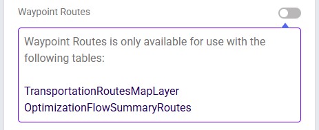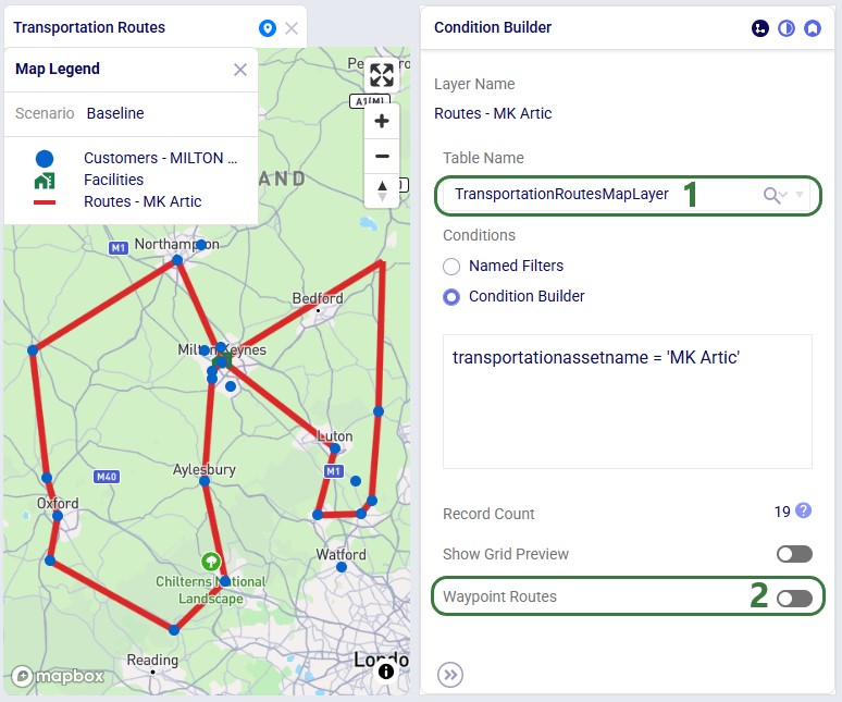 There are 2 tables available in the Table Name drop-down on the Condition Builder panel of a map layer for which waypoint routes can be generated: