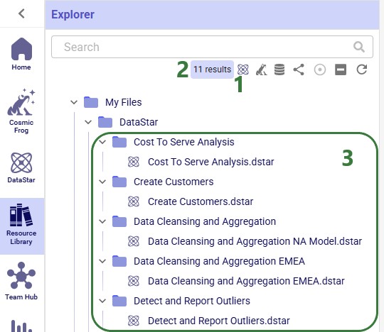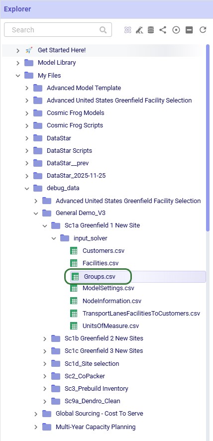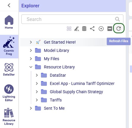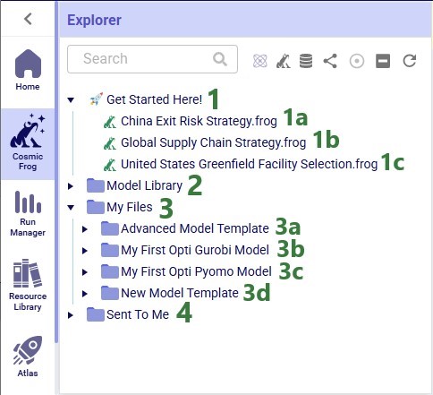 Please note that Cosmic Frog models copied from the Resource Library are placed into a subfolder with the model’s name under the Resource Library folder; they can be recognized in the Explorer by their frog icon to the left of the model’s name and the .frog extension.