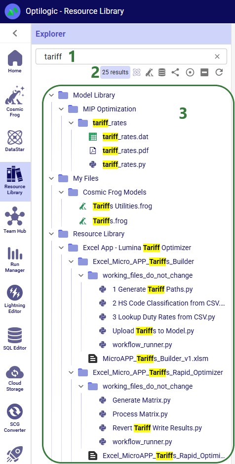 The Resource Library on the Optilogic platform contains example Cosmic Frog models, DataStar template projects, Cosmic Frog for Excel Apps, Python scripts, reference data, utilities, and additional tools to help make Optilogic platform users successful. Users can browse the Resource Library and copy content from there to their own account to explore further (see the “How to use the Resource Library” help center article for more details):