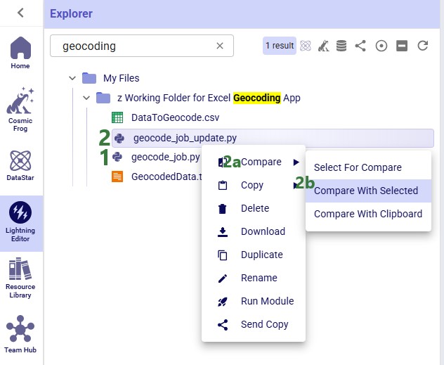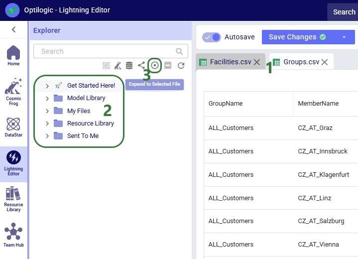In addition to using the Expand to Selected File option, please note that switching to another file in the Lightning Editor by for example clicking on the Facilities.csv file, will further expand the Explorer to show that file in the list too. If needed, the Explorer will also automatically scroll up or down to show the active file in the center of the list.