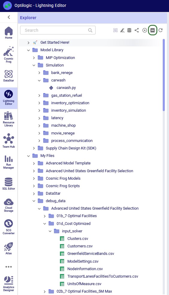 When browsing through the files and folders in your Optilogic account, you may collapse and expand quite a few different folders and their subfolders. Users can at times lose track of where the file they had selected is located. To help with this, users have the “Expand to Selected File” option available to them: