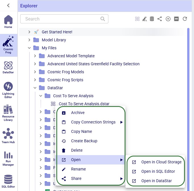 Some file types can be opened in other applications on the Optilogic platform too. These options are available from the right-click context menus, see the “Right-click Context Menus” section further below.