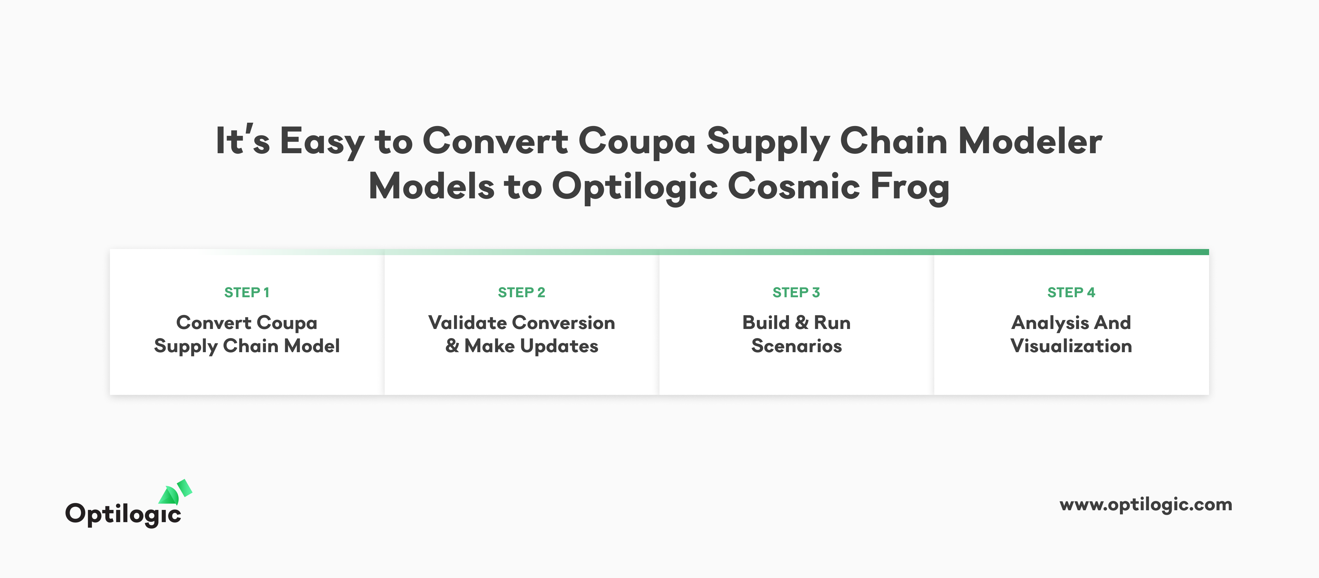 Supply chain design software company Optilogic announced the availability of its converter for Coupa Supply Chain Modeler© which automatically converts Coupa Supply Chain Modeler models to cloud-based Optilogic Cosmic Frog™ models.